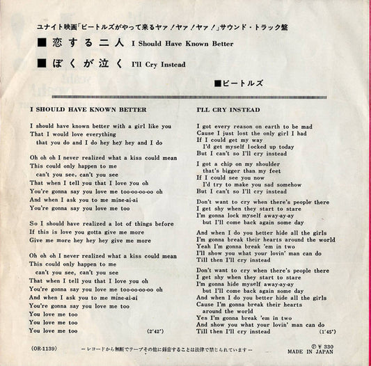 The Beatles = The Beatles - 恋する二人 = I Should Have Known Better / ぼくが泣く = I'll Cry Instead
